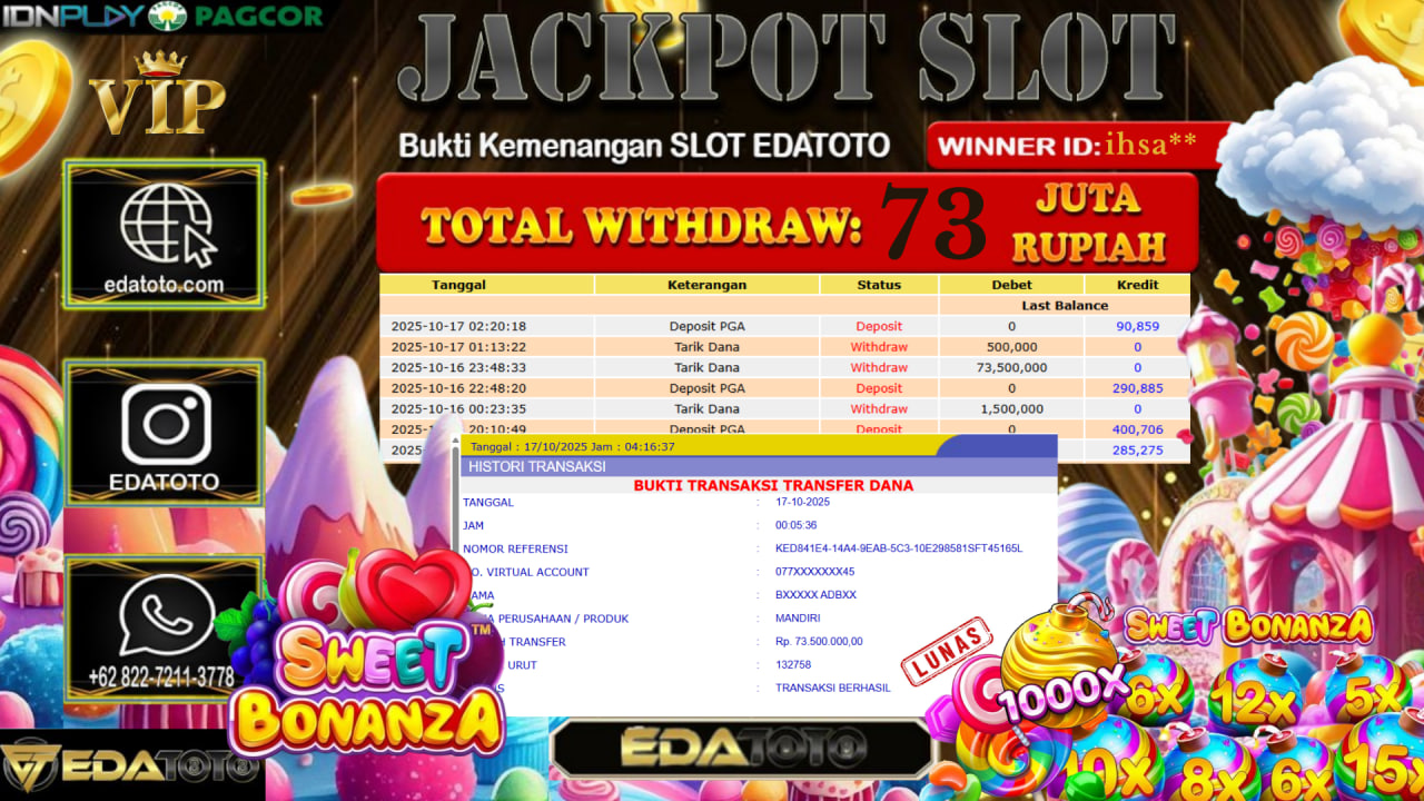 Selamat Kepada Pemilik user ID : ihsa** Hari/Tanggal : Jumat / 17, Oktober 2025 Jackpot : Rp. 73.500.000 JT Permainan . . .