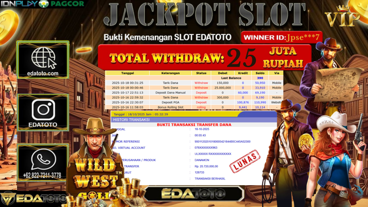 Selamat Kepada Pemilik user ID : Jpse***7 Hari/Tanggal : Sabtu / 18, Oktober 2025 Jackpot : Rp. 25.000.000 JT Permainan . . .