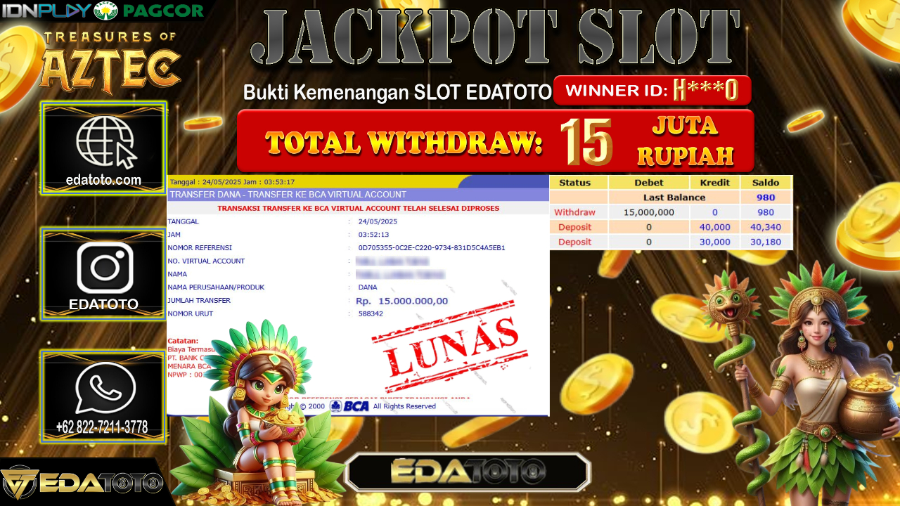 Selamat Kepada Pemilik user ID : H***0 Hari/Tanggal : Sabtu/ 24, Mei 2025 Jackpot : Rp. 15.000.000 JT Permainan : Treasures . . .