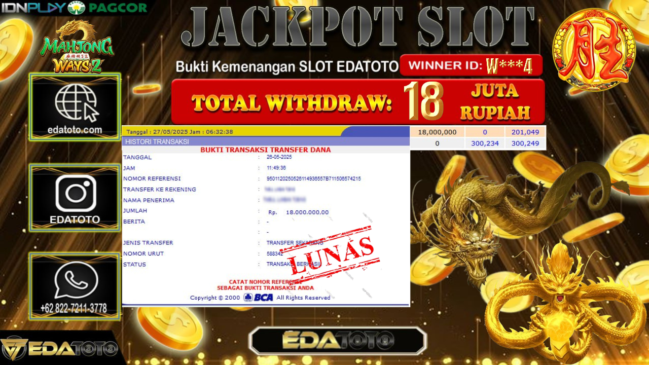 Selamat Kepada Pemilik user ID : W***4 Hari/Tanggal : Selasa/ 27, Mei 2025 Jackpot : Rp. 18.000.000 JT Permainan : Mahjong . . .