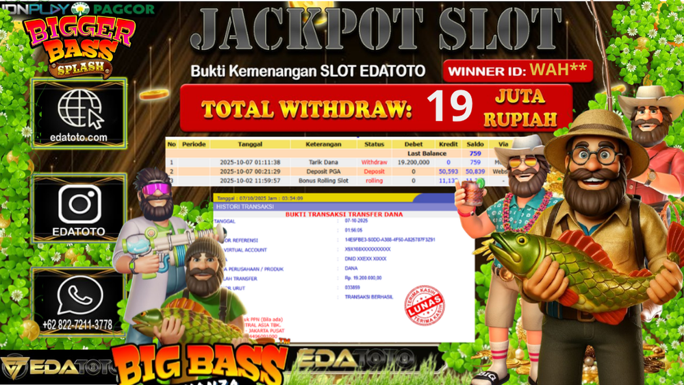 Kepada Pemilik user ID : Wah** Hari/Tanggal : Selasa/ 07, Oktober 2025 Jackpot : Rp. 19.200.000 JT Permainan : Big Bass . . .