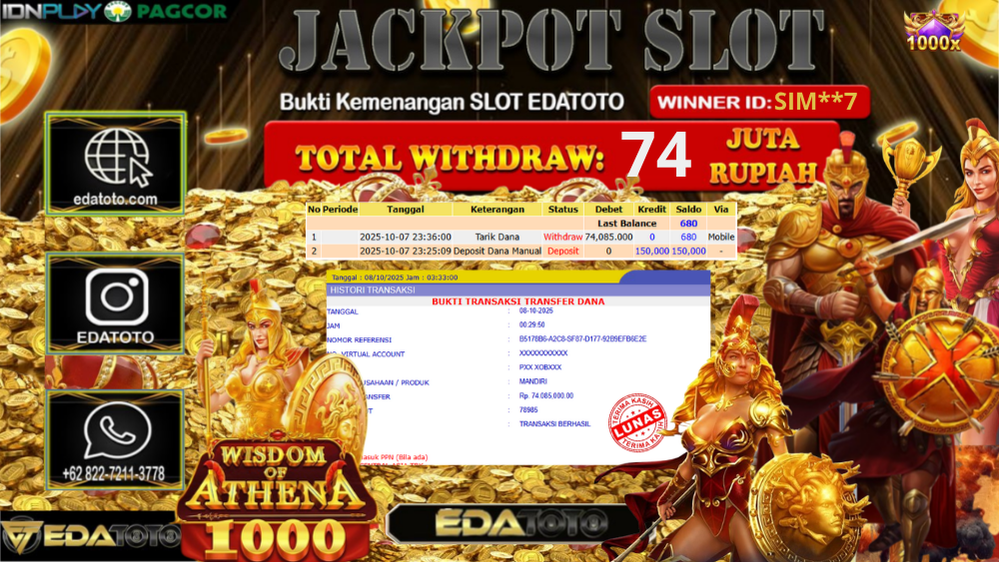 Kepada Pemilik user ID : Sim**7 Hari/Tanggal : Rabu/ 08, Oktober 2025 Jackpot : Rp. 74.085.000 JT Permainan :Wisdom Of Athena . . .