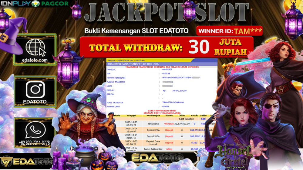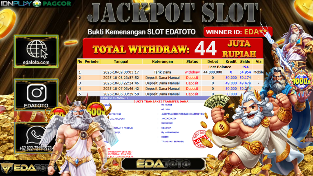 Selamat Kepada Pemilik user ID : EDA** Hari/Tanggal : kamis/ 09, Oktober 2025 Jackpot : Rp. 44.000.000 JT Permainan : . . .