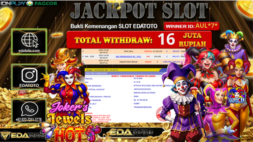 Selamat Kepada Pemilik user ID : aUL*7* Hari/Tanggal : Senin/ 06, Oktober 2025 Jackpot : Rp. 16.168.220 JT Permainan : Joker’s . . .