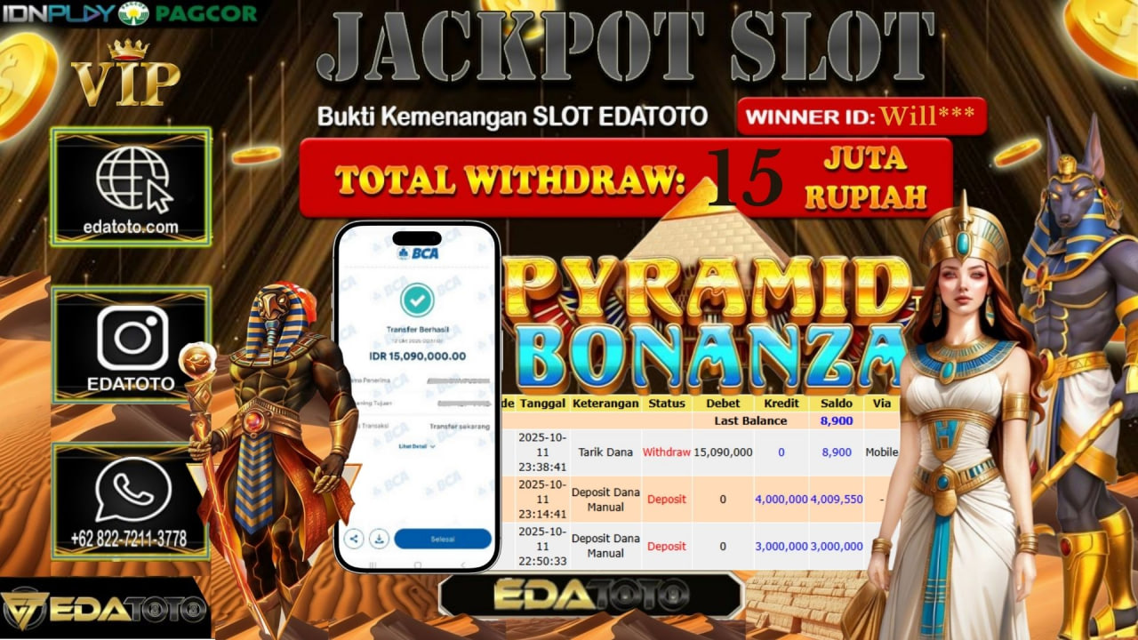 Selamat Kepada Pemilik user ID : Will*** Hari/Tanggal : Sabtu/ 12, Oktober 2025 Jackpot : Rp. 15.090.000 JT Permainan :Pyramid . . .