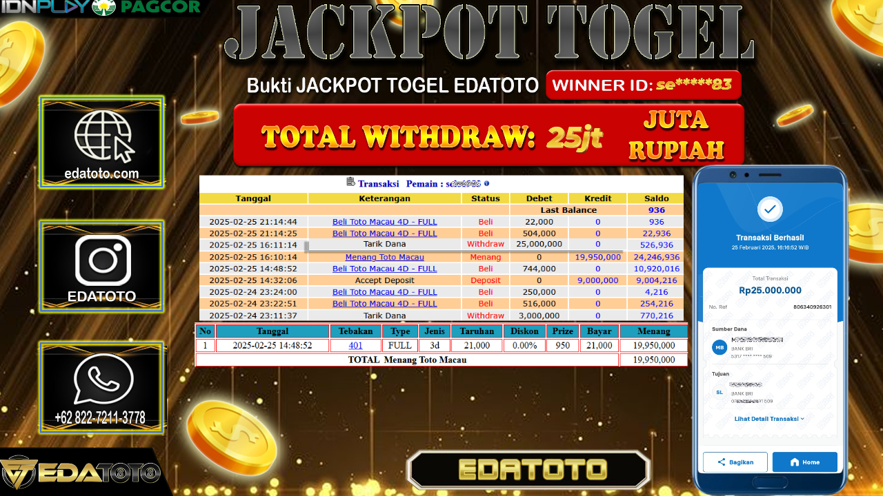 Selamat Kepada Pemilik user ID : se****83 Hari/Tanggal : Senin / 25 , FEBRUARY 2025 Jackpot : Rp. 25.000.000 JT . . .