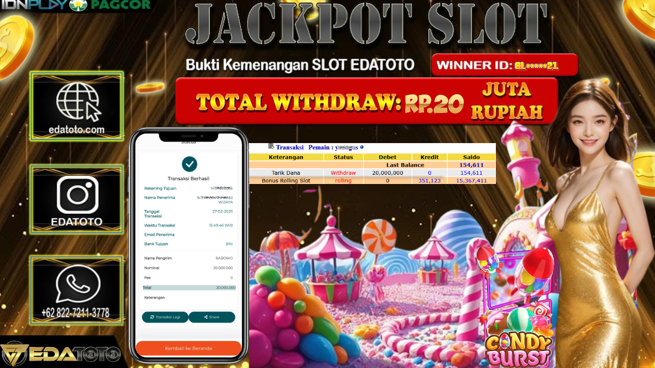 Selamat Kepada Pemilik user ID : bl*****21 Hari/Tanggal : Kamis / 27 , FEBRUARY 2025 Jackpot : Rp. 20.000.000 JT Permainan . . .