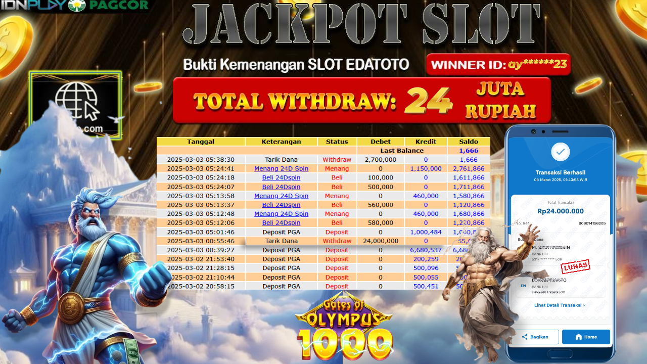 Selamat Kepada Pemilik user ID : ay******23 Hari/Tanggal : Senin / 03 , MARET 2025 Jackpot : Rp. 24.000.000 JT Permainan . . .