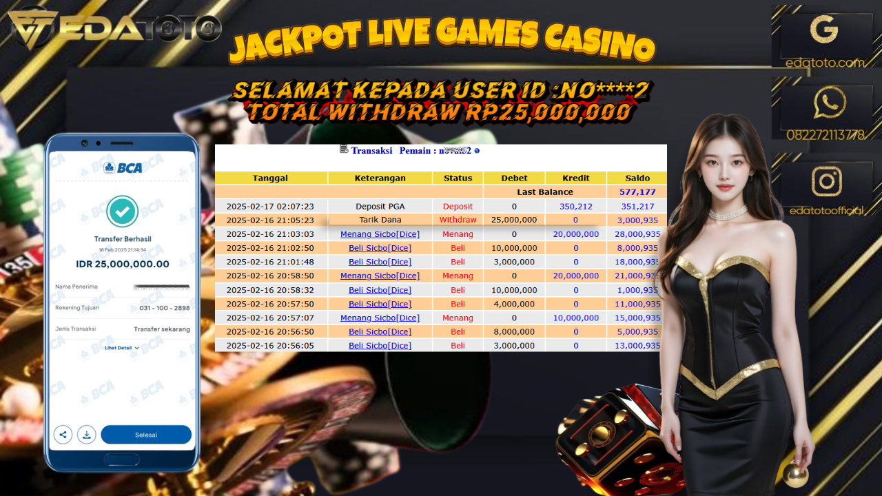 Selamat Kepada Pemilik user ID : no***2 Hari/Tanggal : Senin / 16 , FEBRUARY 2025 Jackpot : Rp. 25.000.000 JT . . .