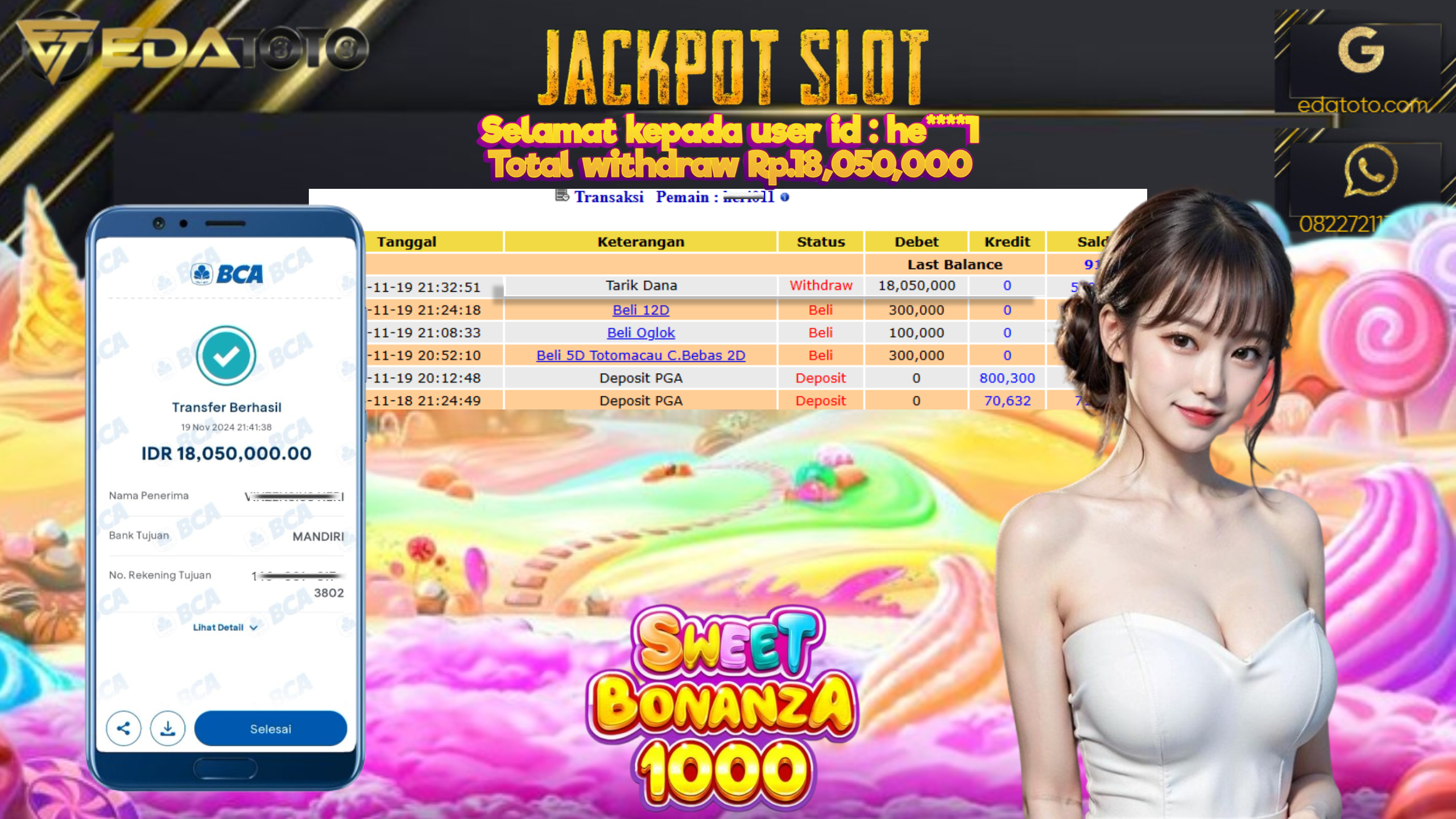 Selamat Kepada Pemilik user ID : he****1 Hari/Tanggal : Jumat/ 19 NOVEMBER 2024 Jackpot : Rp. 18.050.000 JT Permainan : . . .
