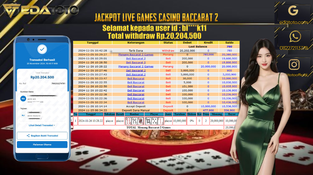 Selamat Kepada Pemilik user ID : bl****k11 Hari/Tanggal : Jumat/ 26 NOVEMBER 2024 Jackpot : Rp. 20.204.500 JT ( biaya . . .