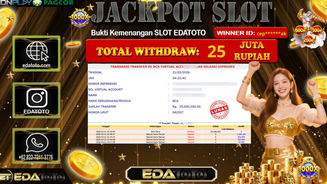 Selamat Kepada Pemilik user ID : cep******ak Hari/Tanggal : Sabtu / 21 MARET 2026 Jackpot : Rp, 25,000,000 JT Withdraw . . .