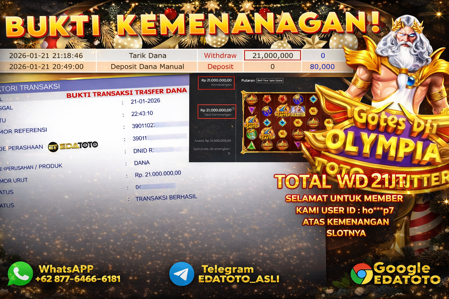 Selamat Kepada Pemilik user ID : ho***p7 Hari/Tanggal :rabu/ 21, Januari 2026 Jackpot : Rp. 21,000,000 JT Withdraw : 21,000,000 . . .