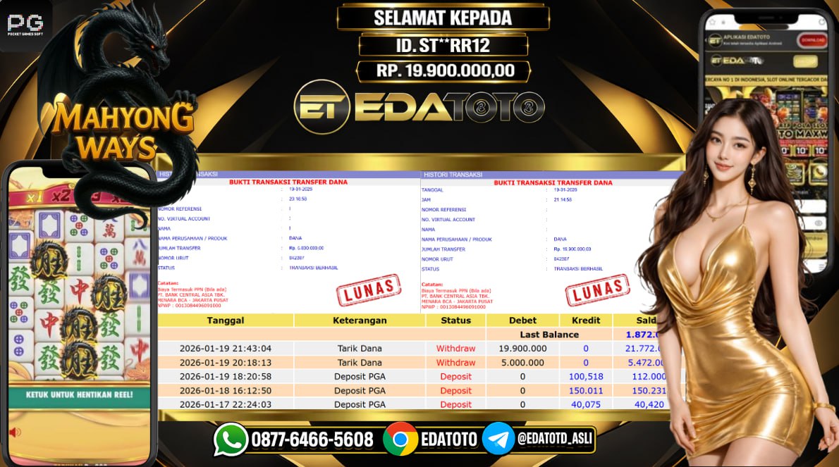 Selamat Kepada Pemilik user ID : ST**RR12 Hari/Tanggal :senin/ 19, Januari 2026 Jackpot : Rp. 19,900,000 JT Withdraw : 19,900,000 . . .