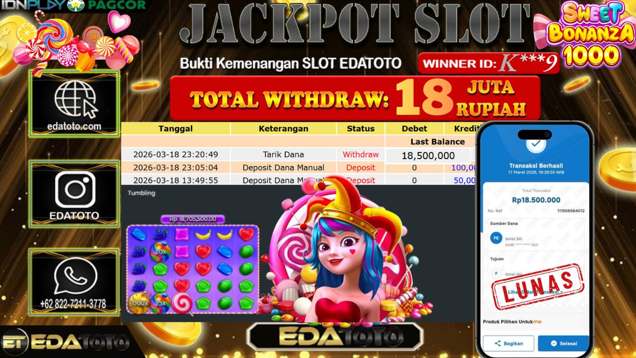 Selamat Kepada Pemilik user ID : K***9 Hari/Tanggal : Rabu / 18 MARET 2026 Jackpot : Rp, 18,705,500 JT Withdraw . . .
