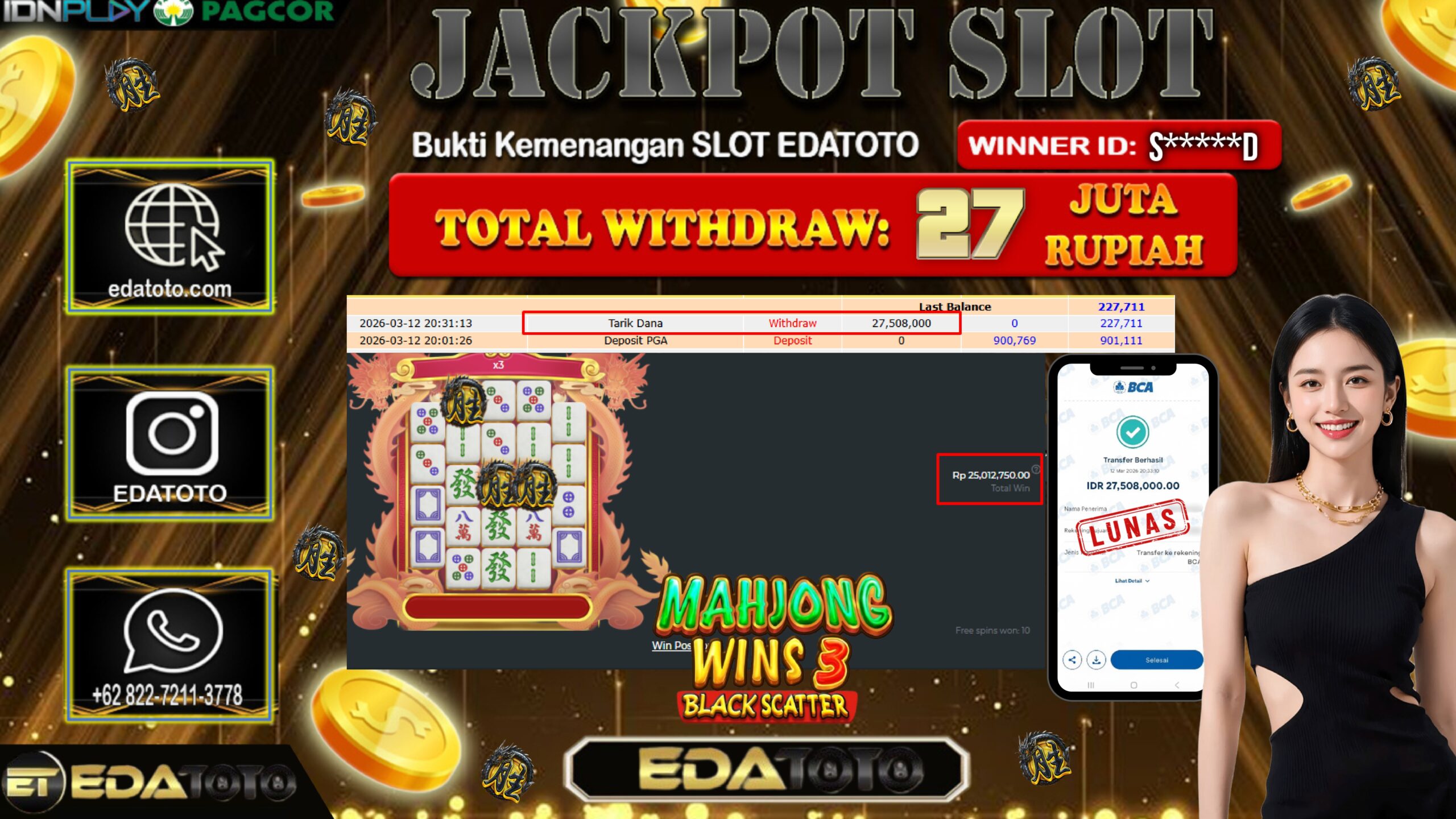 Selamat Kepada Pemilik user ID :S*****D Hari/Tanggal : Kamis / 12 MARET 2026 Jackpot : Rp, 25,012,750 JT Withdraw : . . .