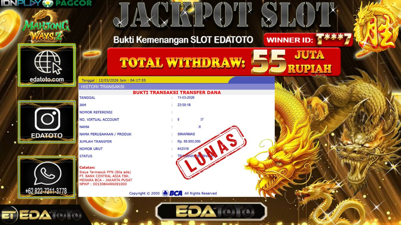 Selamat Kepada Pemilik user ID :T***1 Hari/Tanggal : Rabu / 11 MARET 2026 Jackpot : Rp, 55,850,000JT Withdraw : 55,850,000 . . .