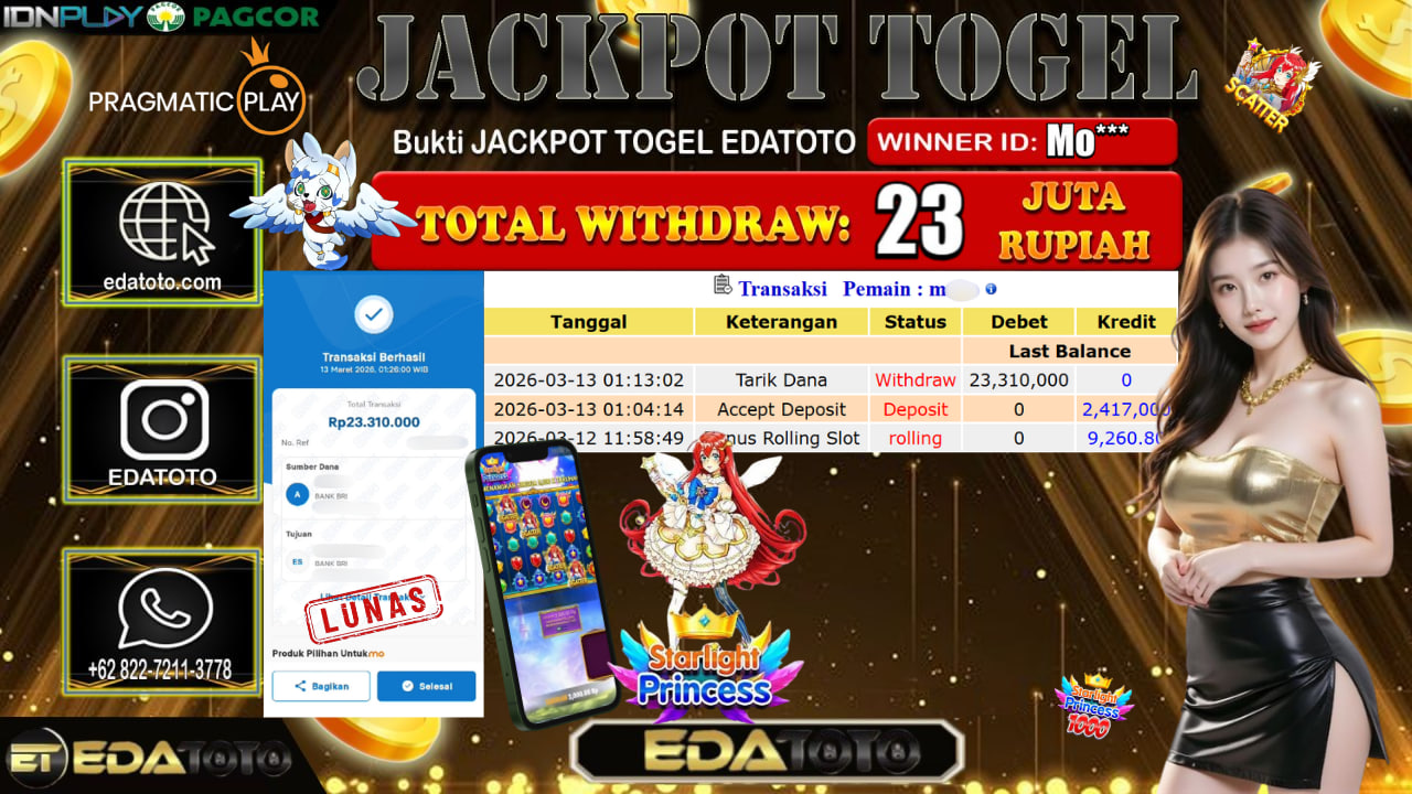 Selamat Kepada Pemilik user ID : Mo*** Hari/Tanggal : Jum’at / 13 MARET 2026 Jackpot : Rp, 21,254,820 JT Withdraw . . .