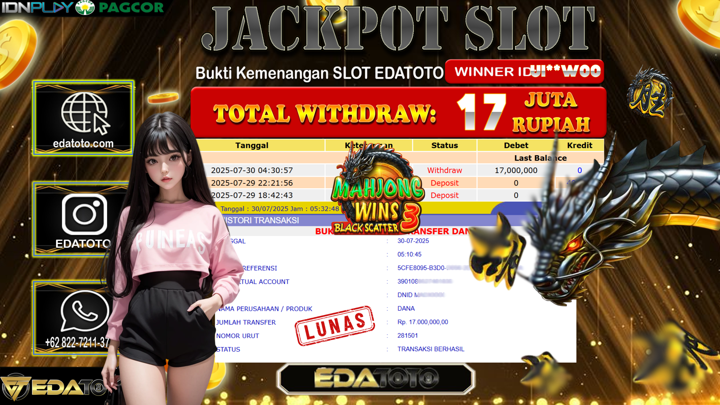 Selamat Kepada Pemilik user ID : UI**w00 Hari/Tanggal : Rabu/ 30, Juli 2025 Jackpot : Rp. 17.000.000 JT Permainan : Mahjong . . .