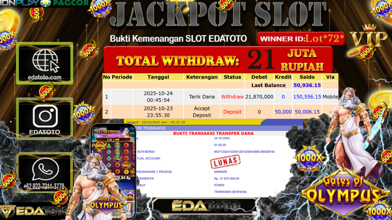 Selamat kepada member setia EDATOTO telah mendapatkan JP Bermain Di ; Gates Of Olympus 1000